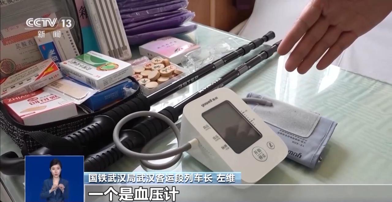 國(guó)鐵武漢局武漢客運(yùn)段列車長(zhǎng) 左維:我們列車提供了以下這些物品:血壓計(jì)、老年人經(jīng)常使用基礎(chǔ)藥包,在車廂里面還設(shè)置了無(wú)障礙廁所,早上還提供軟食,老年旅客更容易消化吸收。