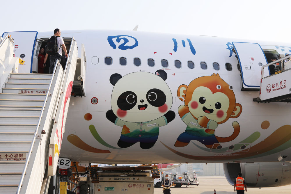 4月18日在成都雙流國際機場拍攝的首架“成都世運號”主題涂裝飛機。新華社記者 楊進 攝