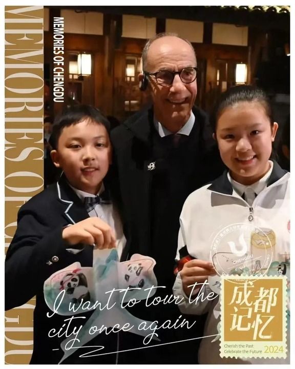 國際大體聯主席艾德收到的成都記憶定制文創(chuàng)風箏。圖為他與成都中小學生的合影。新華社發(fā)