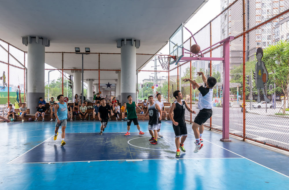 人們在成都市府青路立交橋下的運動空間打籃球。(資料圖)新華社發(fā)(杜寧 攝)
