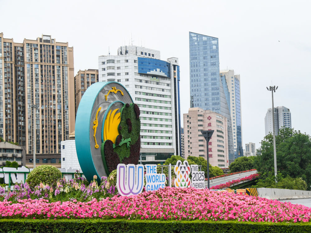 4月29日,在成都人民南路上拍攝的成都世運會主題景觀。新華社記者 王曦 攝