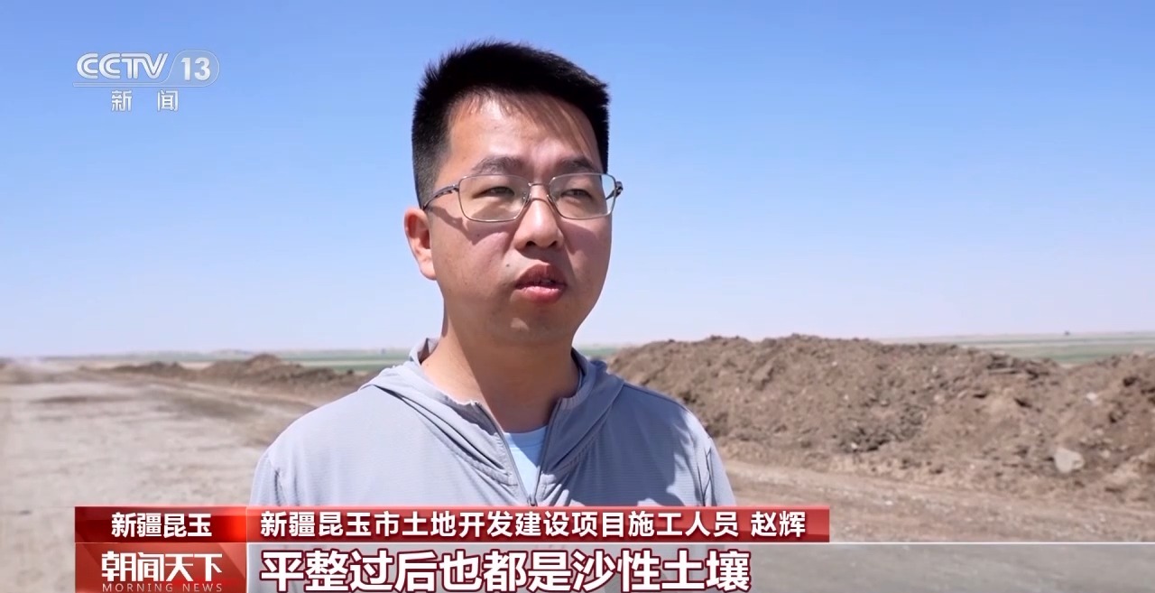 新疆昆玉市土地開(kāi)發(fā)建設(shè)項(xiàng)目施工員 趙輝:這邊原本都是沙漠原始地貌,平整過(guò)后也都是沙性土壤,沙土的營(yíng)養(yǎng)貧瘠,肥力差,抓一把土,能從指縫里漏掉90%。通過(guò)羊糞和水溶肥的有效結(jié)合,施進(jìn)去之后,我們能把沙土的結(jié)構(gòu)團(tuán)?;?,簡(jiǎn)單來(lái)說(shuō)就是把一團(tuán)散沙變成緊密有孔隙的小團(tuán)體,這樣施進(jìn)去的水和營(yíng)養(yǎng)都能留存住。