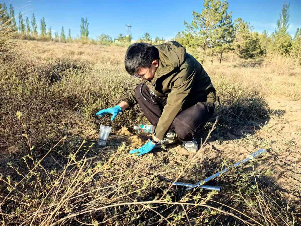 北京林業(yè)大學(xué)博士生農(nóng)皓鈞在野外做荒漠土壤動物研究。新華社記者 馬麗娟 攝