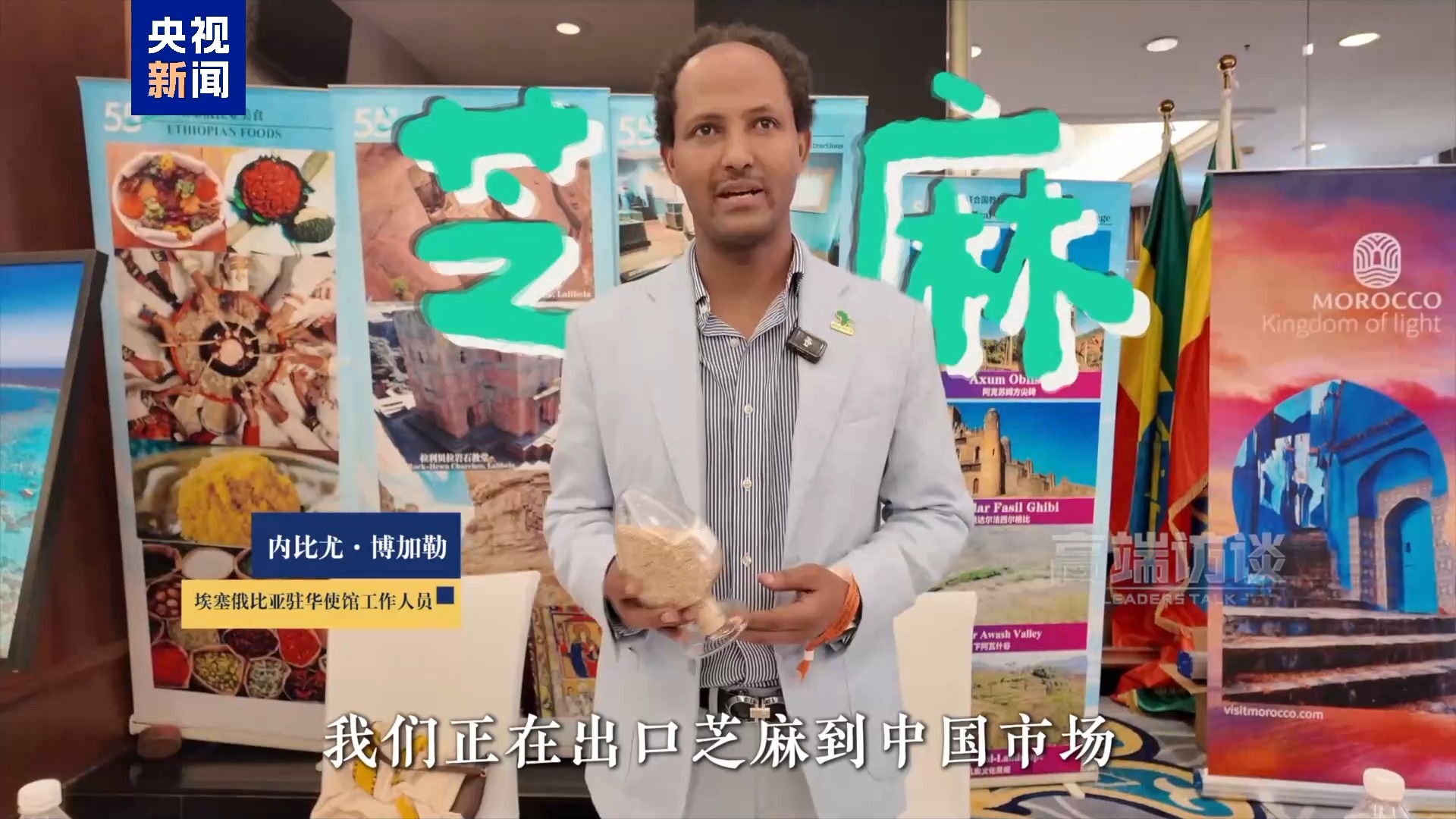 埃塞俄比亞駐華使館工作人員 內(nèi)比尤·博加勒:這是芝麻,我們正在出口芝麻到中國市場。這是埃塞俄比亞的優(yōu)質(zhì)芝麻產(chǎn)品,它們以自然有機聞名。我們受惠于中國的貿(mào)易政策,借助中非合作的平臺將這些芝麻出口到中國市場。