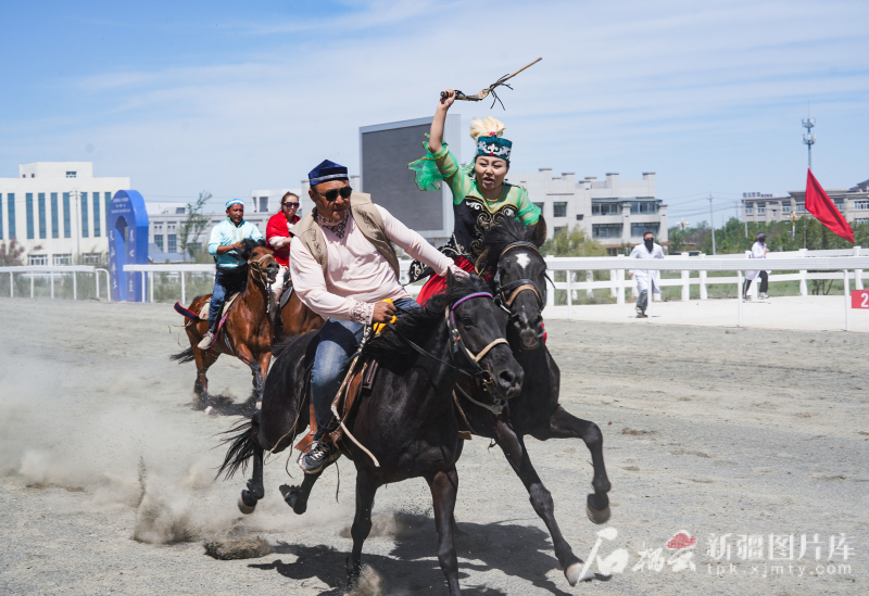 5月31日,中國(guó)·新疆第五屆駱駝產(chǎn)業(yè)展暨全疆賽馬大會(huì)在木壘哈薩克自治縣激情啟幕?;顒?dòng)現(xiàn)場(chǎng)在進(jìn)行“姑娘追”表演。常誼誼 攝