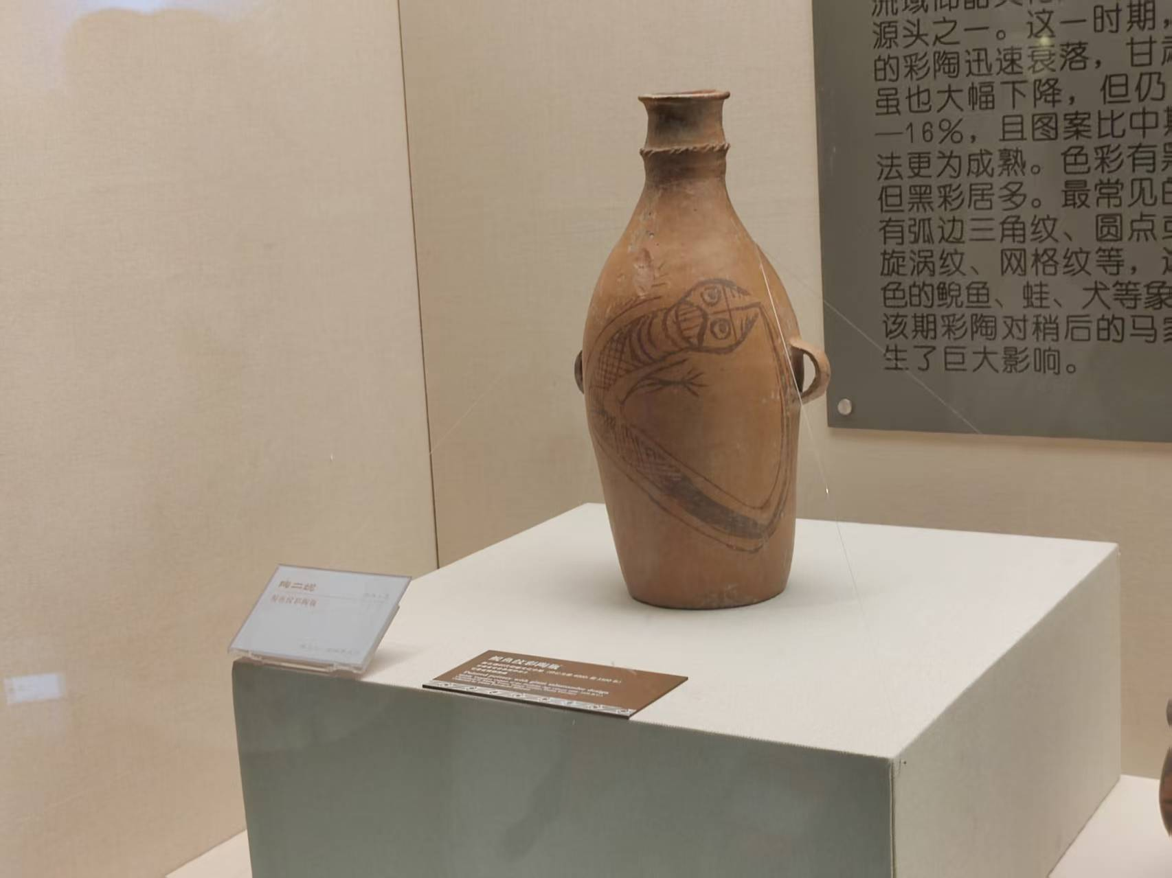 在“彩陶之鄉(xiāng)”主題展區(qū),仰韶文化鯢魚紋彩陶瓶成為焦點(diǎn)。這件距今5500年的陶瓶,腹部繪有人面鯢魚紋,被認(rèn)為是早期“龍圖騰”的雛形?!八赡苁欠诵蜗蟮某橄蟊磉_(dá),印證了甘肅作為中華文明重要發(fā)源地之一?!敝v解員介紹。作為甘肅唯一一件彩陶類國寶,其神秘圖案引發(fā)了采訪團(tuán)對(duì)史前先民精神世界的無限遐想。