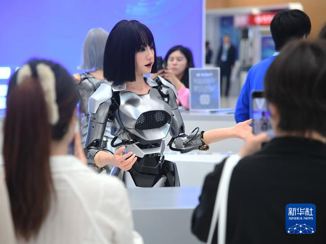 仿生人形機(jī)器人在2024中關(guān)村論壇年會(huì)會(huì)場設(shè)置的咨詢臺(tái)“迎賓”(2024年4月27日攝)。新華社記者 任超 攝
