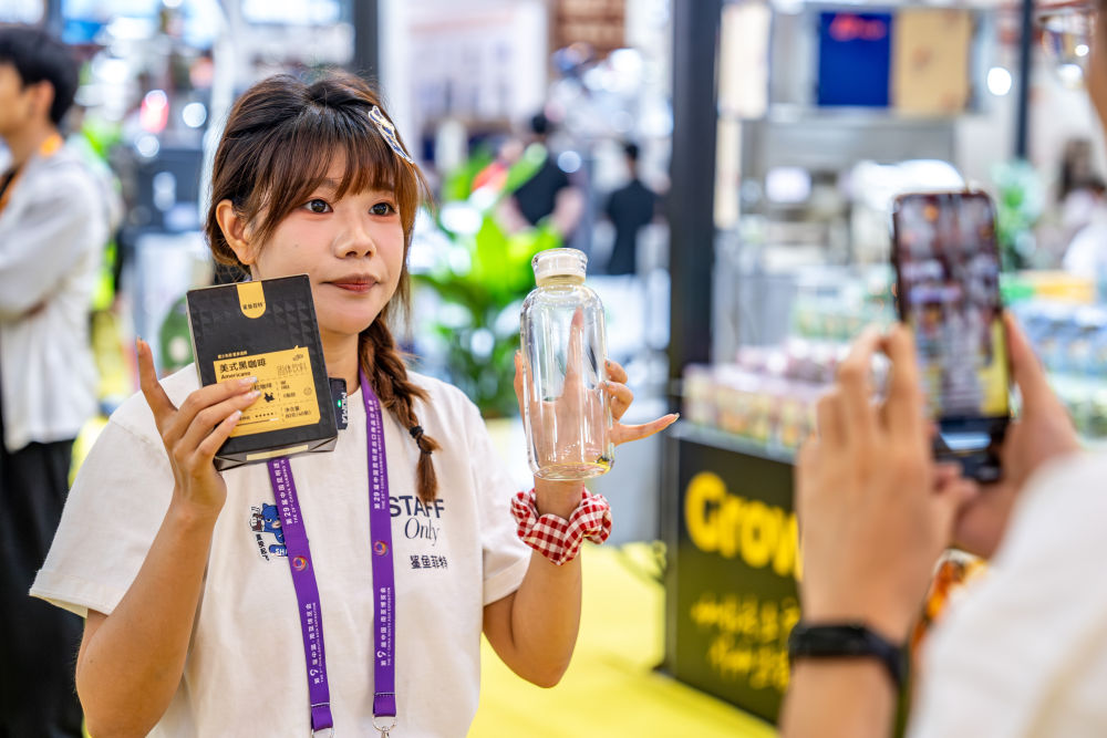 6月19日,一名參展商在第9屆中國(guó)—南亞博覽會(huì)咖啡產(chǎn)業(yè)館直播推介云南小粒咖啡。新華社記者胡超 攝