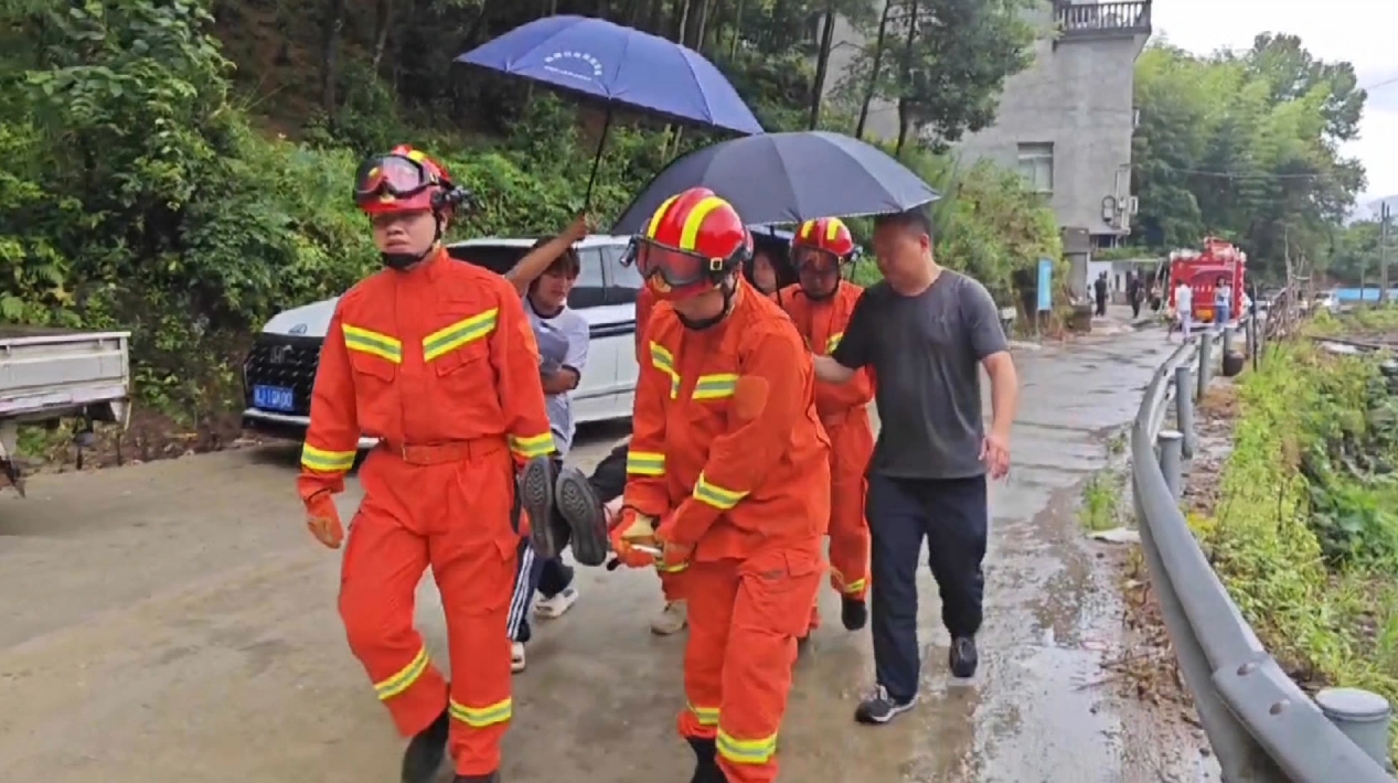 在臺(tái)州黃巖嶼頭鄉(xiāng),轉(zhuǎn)移小組在排查中發(fā)現(xiàn)上鳳村一處地質(zhì)災(zāi)害隱患點(diǎn)居住著一位92歲老人,大家立即取來擔(dān)架將老人慢慢抬出。在大家冒雨接力下,老人被護(hù)送至安置點(diǎn)。