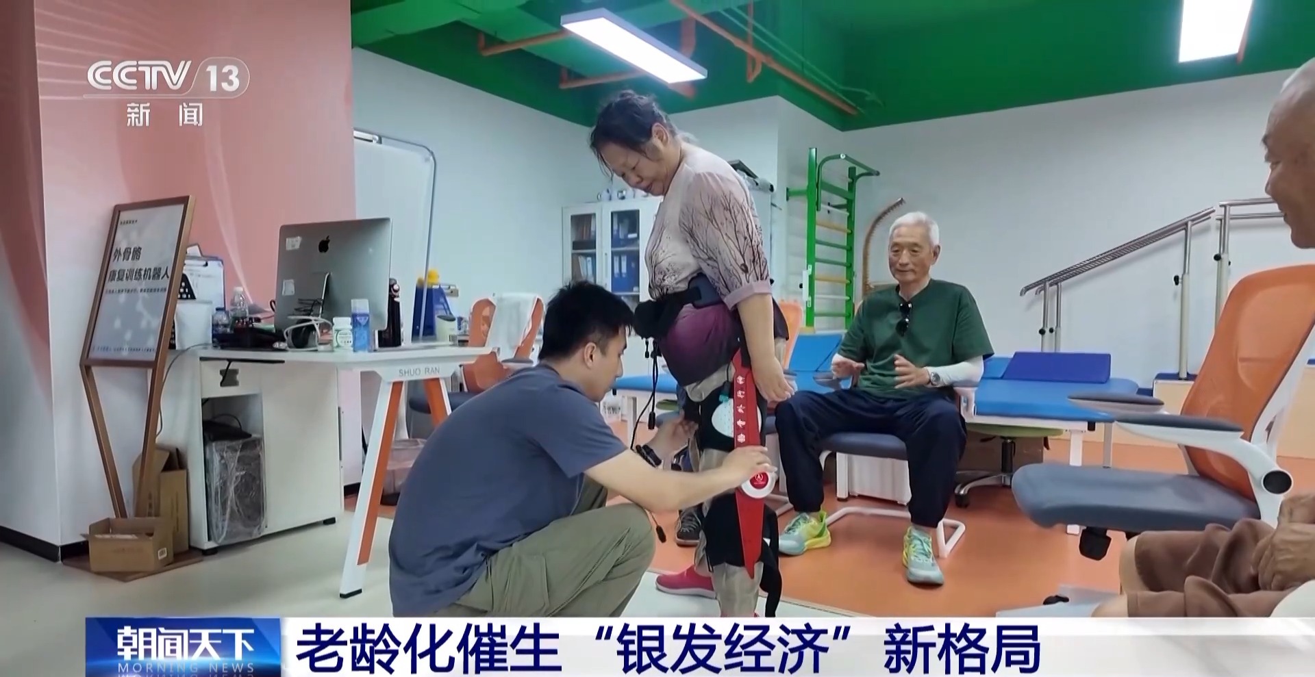 在這個(gè)外骨骼機(jī)器人康復(fù)訓(xùn)練中心,記者看到幾位老年志愿者正在測(cè)試一款助力行走的外骨骼機(jī)器人。