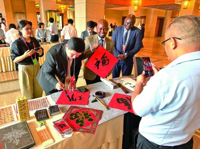 與會(huì)外國(guó)嘉賓在會(huì)議間隙體驗(yàn)寫(xiě)福字。光明日?qǐng)?bào)記者 楊逸夫攝/光明圖片