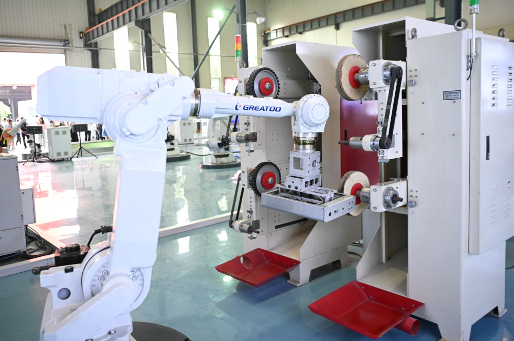 位于揭陽的巨輪智能裝備股份有限公司的光伏控制箱機(jī)器人打磨單元(6月29日攝)。新華社記者鄧華攝