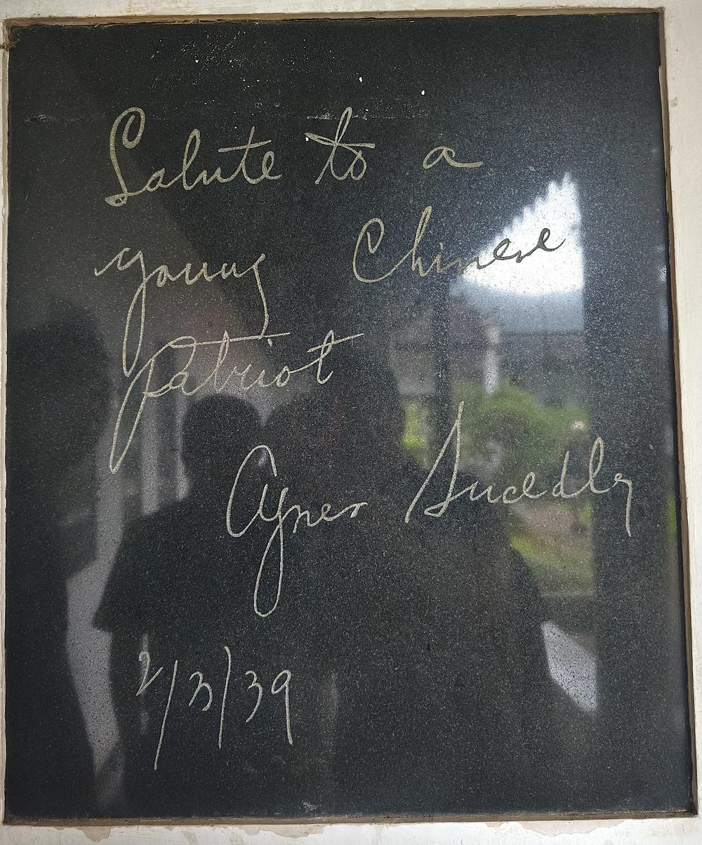 1939年史沫特萊寫給新四軍教導(dǎo)總隊(duì)學(xué)員葛涼的一句話語(yǔ),如今也被鐫刻在石碑之上——“Salute to a young Chinese patriot(向一位年輕的中國(guó)愛國(guó)者致敬)”。