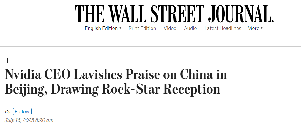 美國《華爾街日報(bào)》報(bào)道稱,市值達(dá)4萬億美元的AI芯片公司掌門人黃仁勛在訪問北京期間多次表達(dá)對中國的贊賞,盛贊中國的科技進(jìn)步。