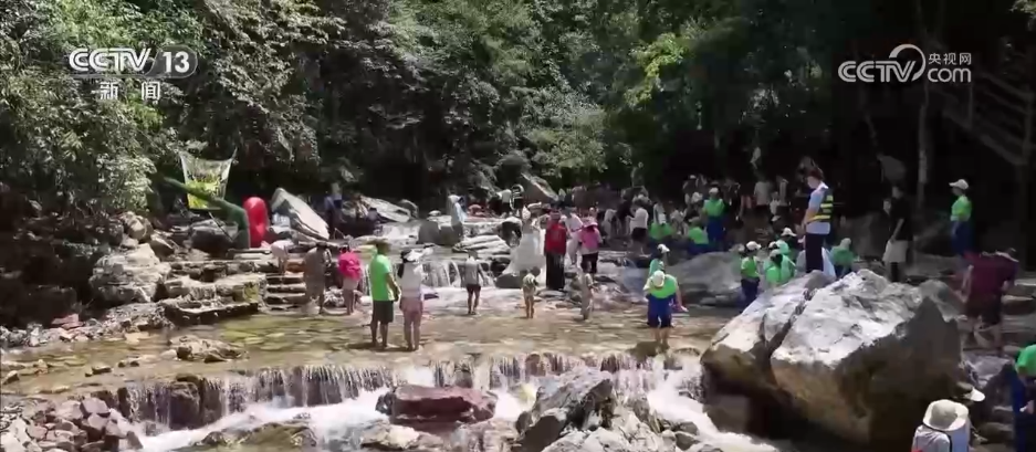 在大峽谷谷底,形態(tài)各異的峰林與緩緩流淌的溪水構(gòu)成了天然畫卷,陣陣微涼的山風(fēng)吹來,游客們仿佛漫步在原始森林中,在喧囂的夏天中感受到了一份難得的靜謐和涼爽。