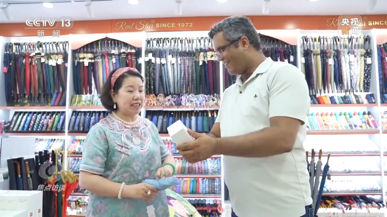 張吉英是義烏小商品市場的一位傘具經(jīng)營戶。今年,她店鋪里一款經(jīng)過創(chuàng)新設(shè)計的防曬傘,在國外掀起了一股流行風(fēng)潮,與國內(nèi)消費(fèi)者追求防曬傘小巧輕便不同,國外客戶更偏愛大尺寸款式。比如在中東地區(qū),人們喜歡雨傘里面能噴水霧的款式,以追求更好的降溫體驗。
