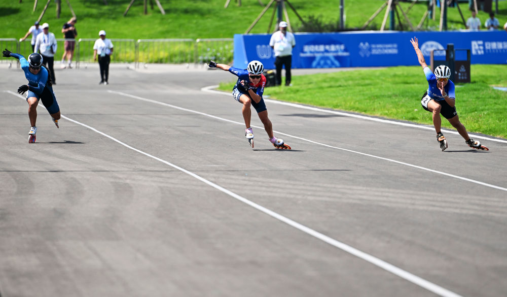8月13日,2025年成都世運(yùn)會(huì)速度輪滑公路賽(100米爭先)女子決賽在成都舒悅公園舉行。新華社記者 謝劍飛 攝