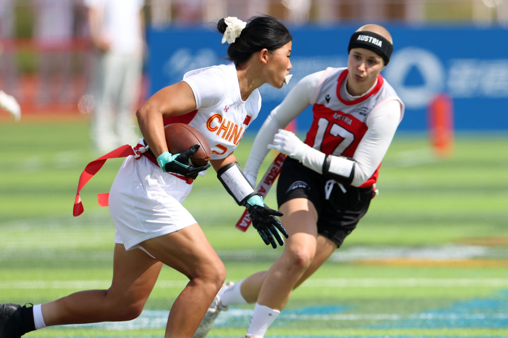 8月14日,在2025年成都世運(yùn)會腰旗橄欖球女子預(yù)賽A組比賽中,中國隊(duì)45:47不敵奧地利隊(duì)。圖為中國隊(duì)球員高子旋(左)在比賽中。新華社記者 陳斌 攝