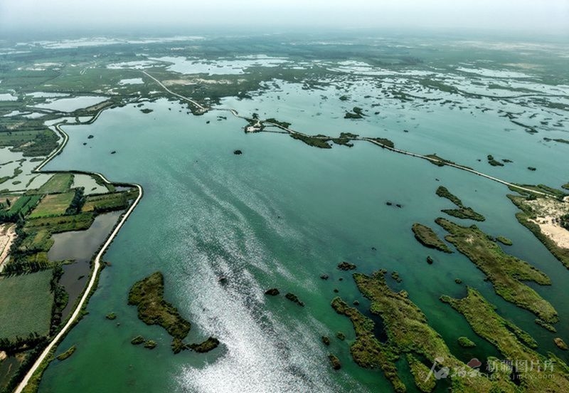 俯瞰塔克拉瑪干沙漠邊緣的拉里昆國家濕地公園(8月6日無人機(jī)攝)。天山網(wǎng)-新疆日報記者 鄒懿 攝