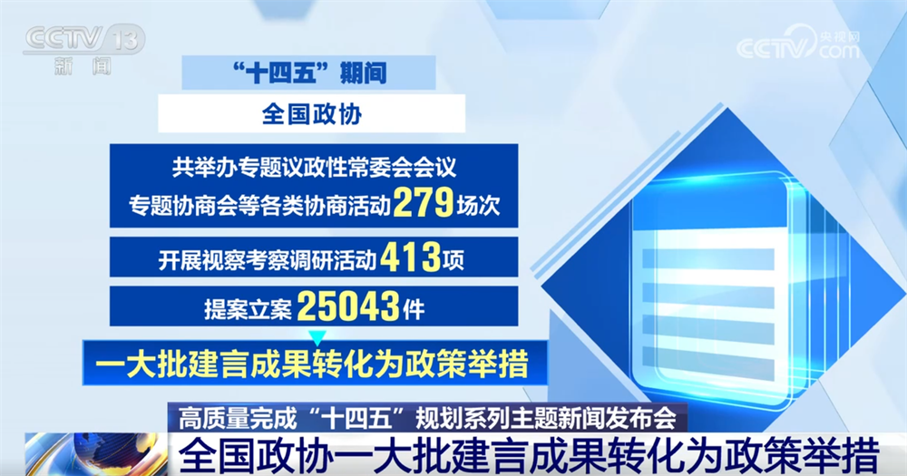 “十四五”期間,全國(guó)政協(xié)共舉辦專題議政性常委會(huì)會(huì)議、專題協(xié)商會(huì)等各類協(xié)商活動(dòng)279場(chǎng)次,開(kāi)展視察考察調(diào)研活動(dòng)413項(xiàng),提案立案25043件,一大批建言成果轉(zhuǎn)化為政策舉措。