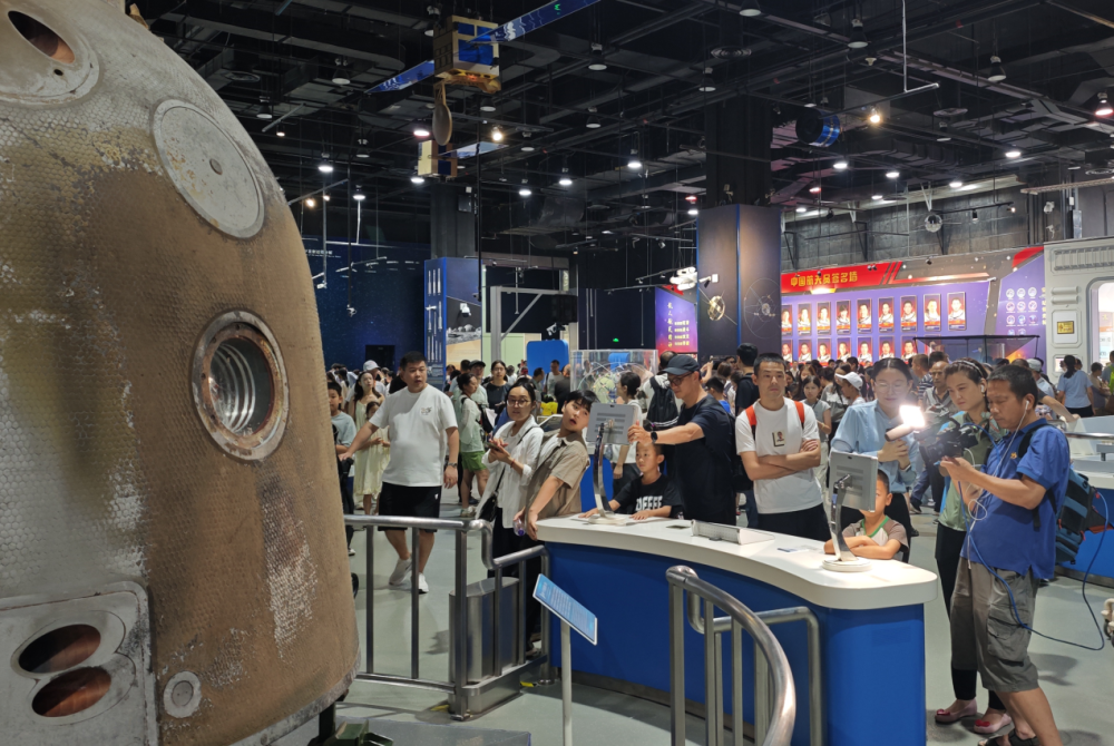 暑期的中國科技館人頭攢動(dòng),“神舟一號(hào)”返回艙實(shí)物吸引游客圍觀。(中國科技館供圖)