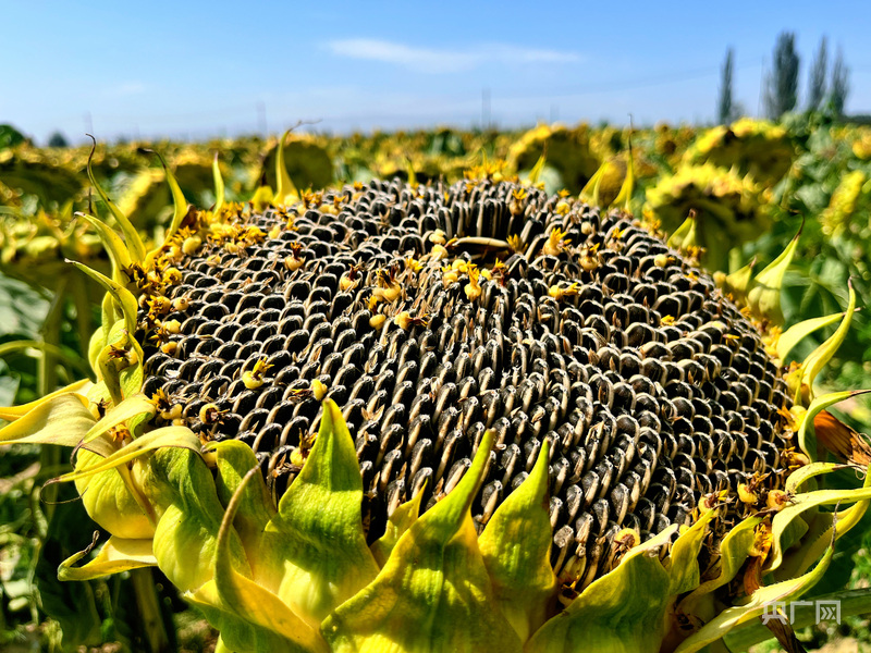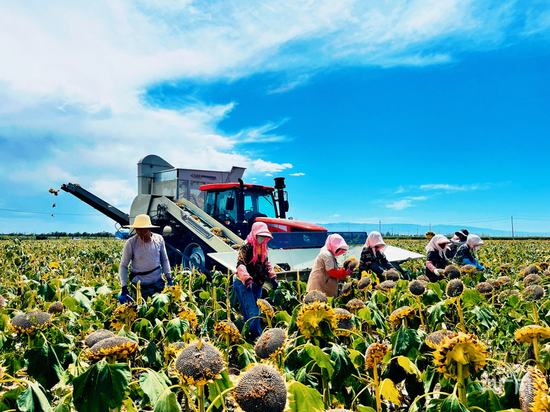 在這片萬(wàn)畝連片種植區(qū),種植戶王多寶正帶領(lǐng)工人切割葵盤(pán)、插桿晾曬。“今年天氣好,葵花長(zhǎng)勢(shì)特別旺,籽粒又大又亮,產(chǎn)量肯定差不了?!北M管汗水浸濕衣衫,喜悅卻洋溢在他的臉龐。