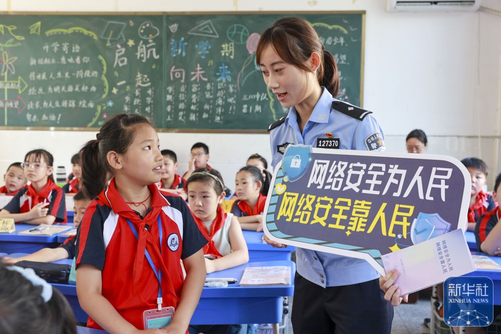 9月15日,在江蘇省泰興市襟江小學(xué)教育集團佳源校區(qū),泰興市公安局城北派出所民警通過互動方式在給學(xué)生講解網(wǎng)絡(luò)安全知識。新華社發(fā)(顧繼紅攝)