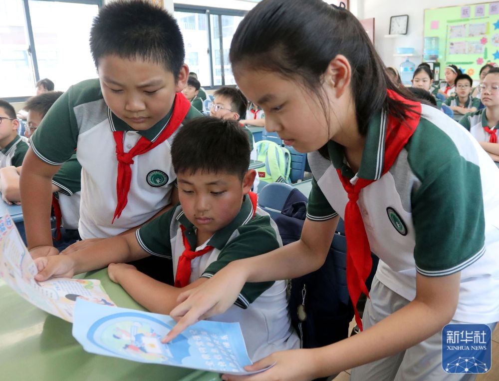 9月15日,在山東省青島市市北區(qū)延安二路小學(xué)開展的網(wǎng)絡(luò)安全教育主題活動上,民警為學(xué)生們講解防范電信詐騙小常識。新華社發(fā)(王海濱攝)