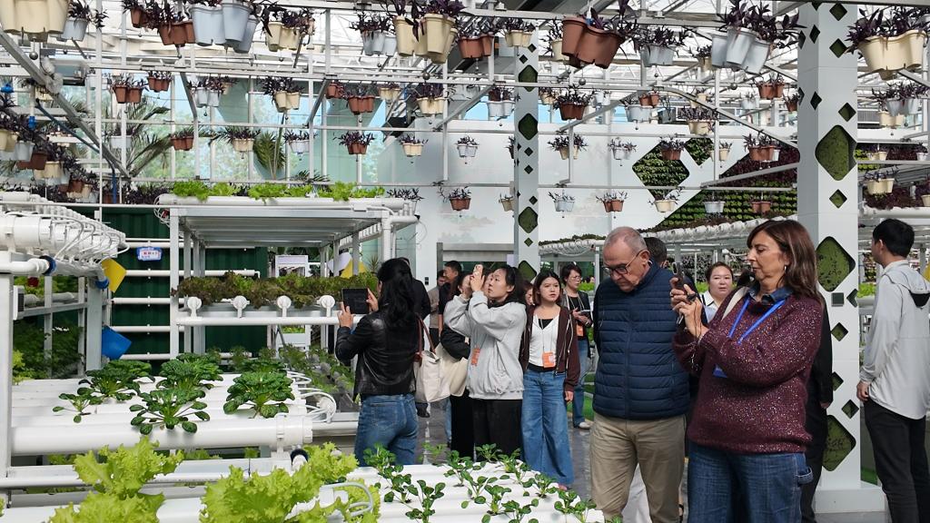 走進(jìn)昌吉新疆農(nóng)業(yè)博覽園內(nèi)的垂直農(nóng)業(yè)展示區(qū)、葉菜工廠示范區(qū)和果菜工廠示范區(qū),目睹無土栽培、無人機(jī)灌溉、光合作用智能調(diào)控等一系列農(nóng)業(yè)高科技應(yīng)用為作物“量身定制”生長(zhǎng)環(huán)境,參訪議員們紛紛拍照記錄。