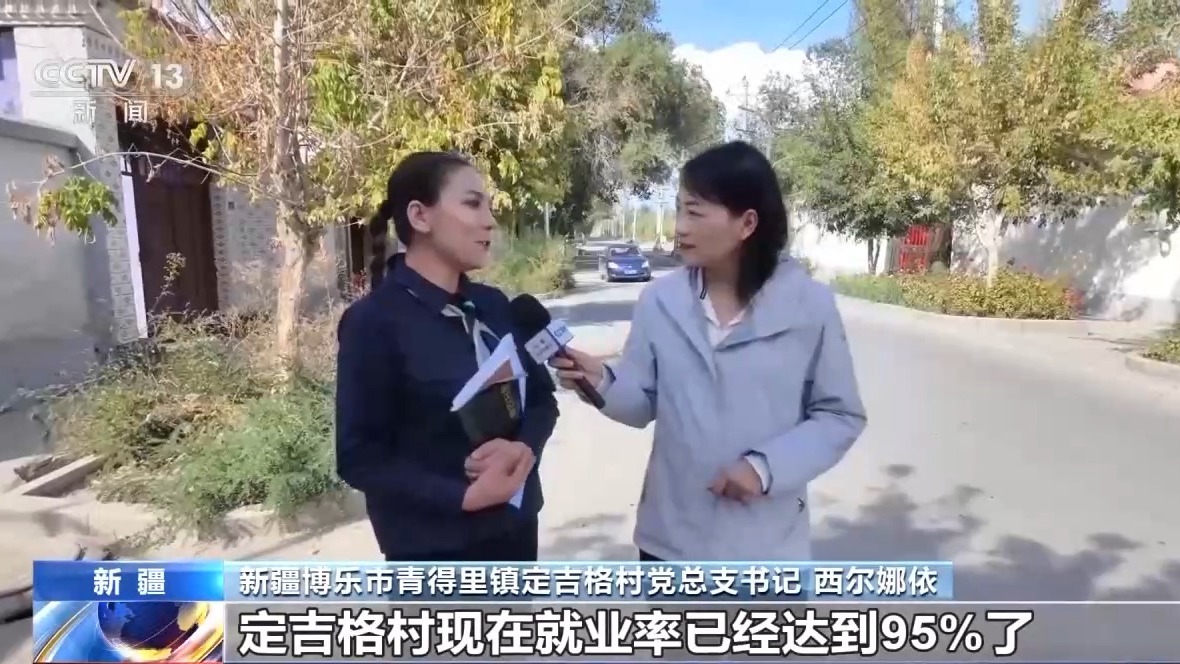 新疆博樂市青得里鎮(zhèn)定吉格村黨總支書記 西爾娜依:定吉格村現(xiàn)在就業(yè)率已經(jīng)達(dá)到95%了,相當(dāng)于每個(gè)人都有活干,每個(gè)人都有錢掙。