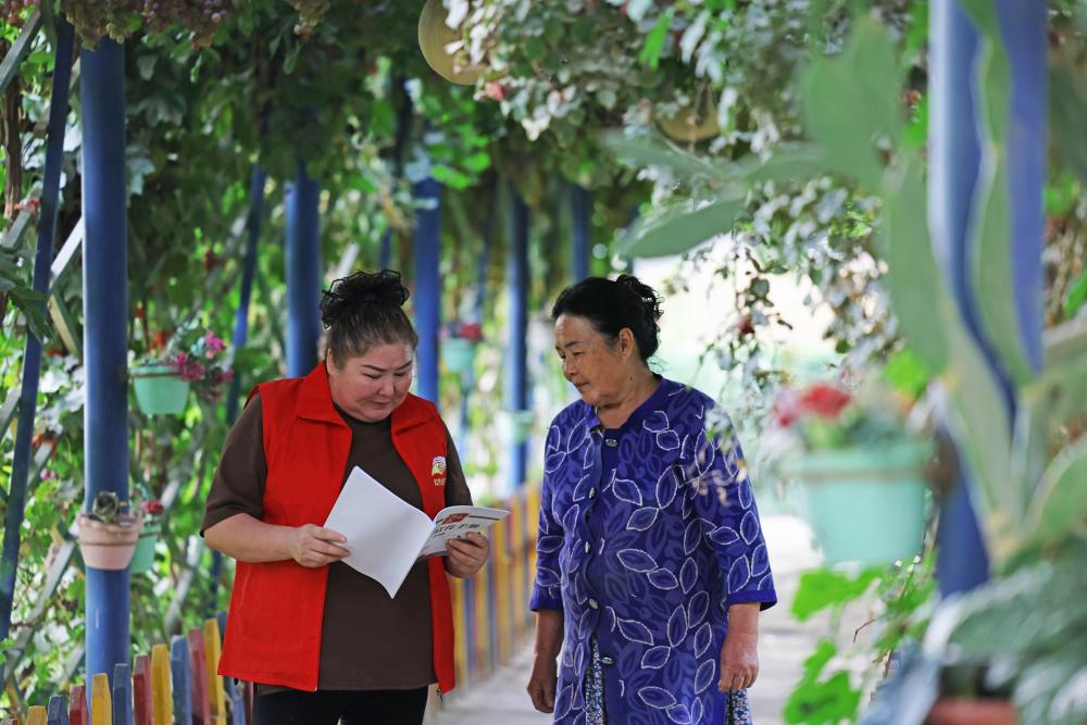 9月18日,達(dá)西村村干部古力帕爾力·克衣木(右)入戶詢問(wèn)村民生活情況。