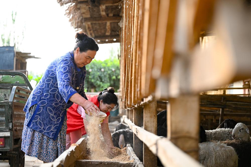 9月18日,達(dá)西村村干部卡麥爾汗·蘇來(lái)曼(后)入戶幫助村民喂羊。