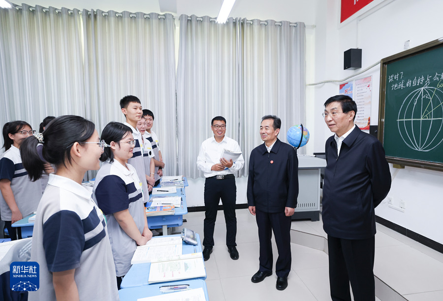9月25日下午,受習(xí)近平總書記囑托,中共中央政治局常委、全國政協(xié)主席、中央代表團(tuán)團(tuán)長王滬寧帶領(lǐng)中央代表團(tuán)部分成員在巴音郭楞蒙古自治州庫爾勒市看望慰問當(dāng)?shù)馗髯甯刹咳罕?。這是王滬寧和中央代表團(tuán)部分成員在庫爾勒市第二十三中學(xué)考察教育援疆情況。新華社記者 姚大偉 攝