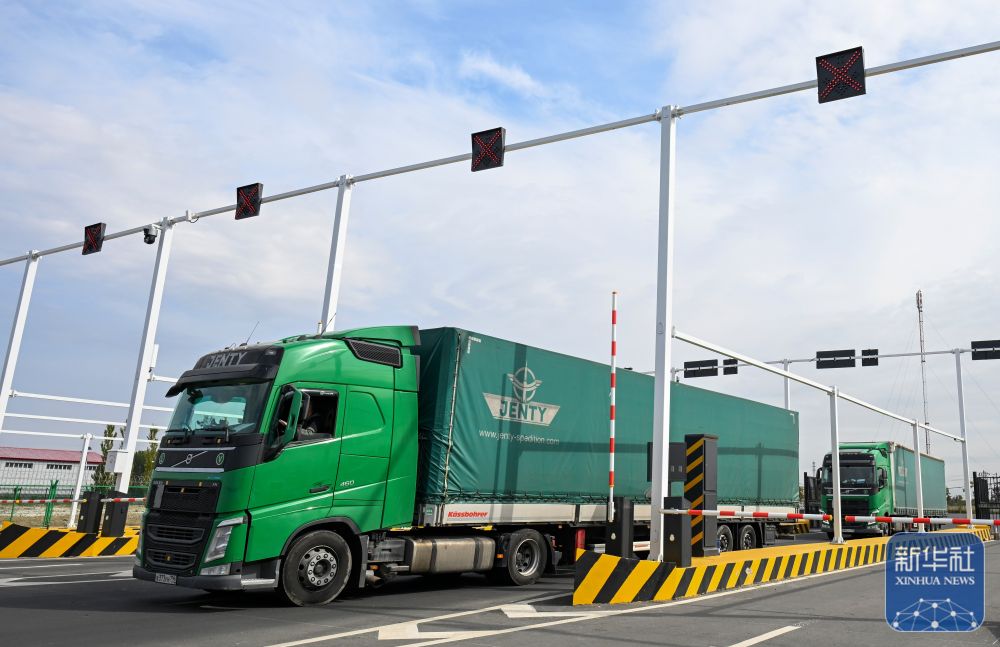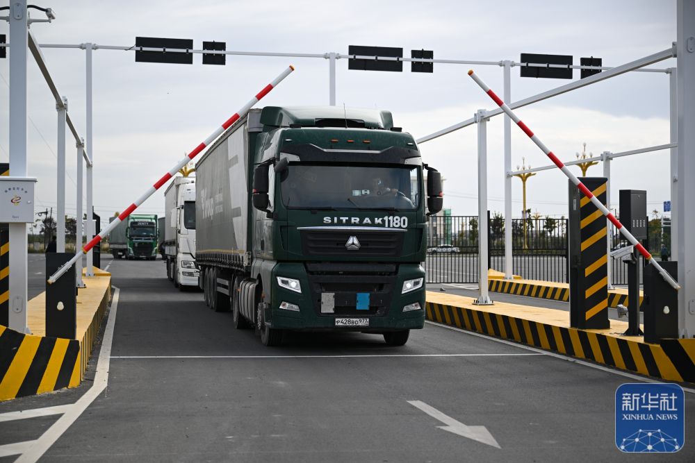 ↑9月17日,來自俄羅斯的貨車從位于新疆塔城地區(qū)的巴克圖口岸海關(guān)集中查驗場地出關(guān)。