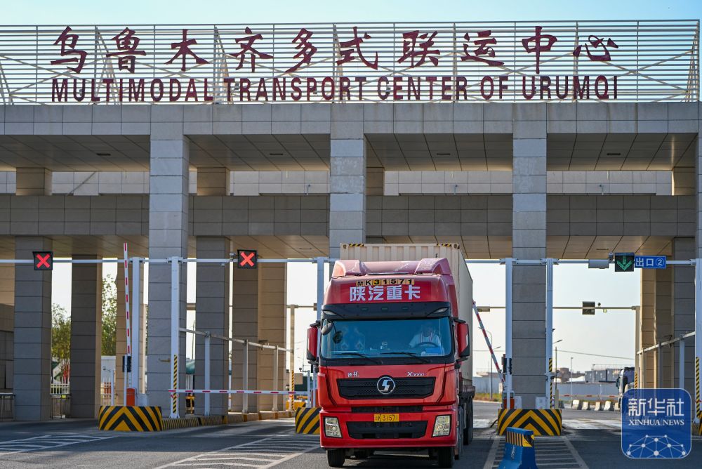 ↑9月15日,一輛貨車駛?cè)胛挥谛陆疄豸斈君R國際陸港區(qū)的烏魯木齊多式聯(lián)運中心。