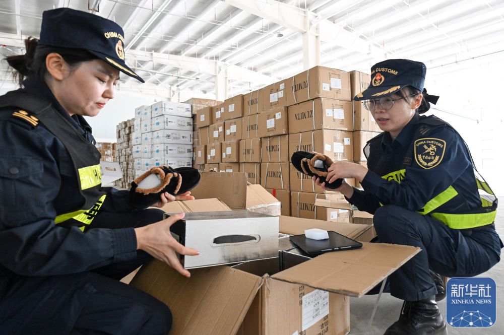 ↑9月17日,新疆塔城海關(guān)工作人員在巴克圖口岸集中查驗區(qū)檢查一批經(jīng)由該口岸運往哈薩克斯坦的鞋品。