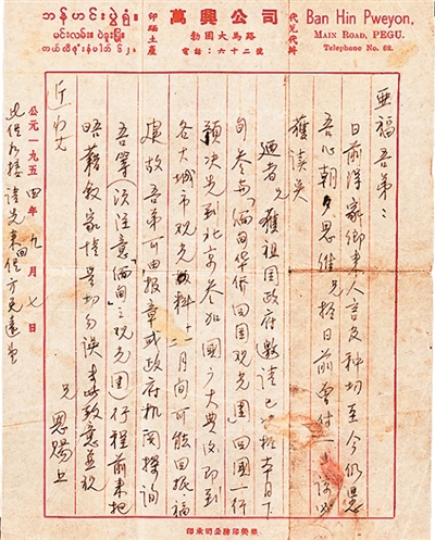 廼者兄獲祖國政府邀請,已決于本月下旬參與“緬甸華僑回國觀光團(tuán)”回國一行,預(yù)決先到北京參加國慶大典,后即到各大城市觀光,料十一二月間可能回抵福建,故吾弟可由報章或政府機關(guān)探詢吾等(須注意“緬甸”之觀光團(tuán))行程,前來把晤,藉敘家情,是切勿誤。