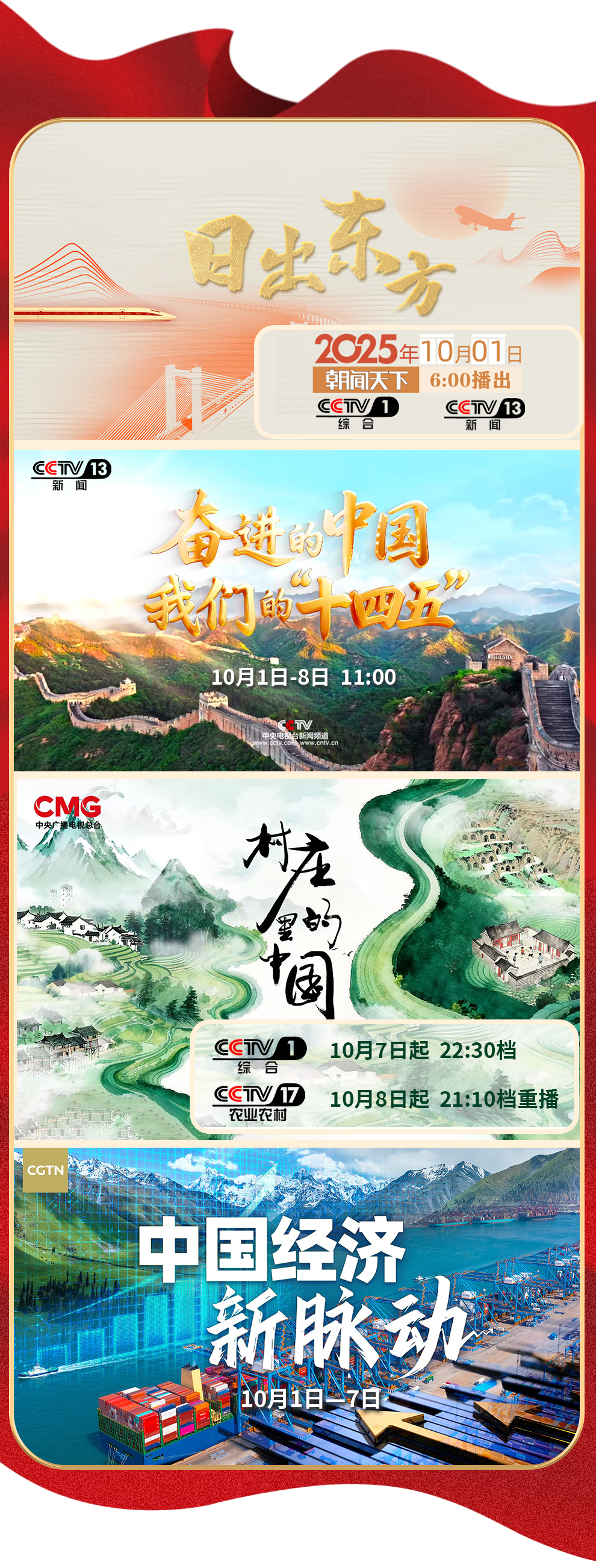 新時(shí)代中國(guó)的動(dòng)人故事里,主角正是新征程上奮進(jìn)的你我。在雄壯的國(guó)歌聲中,跟隨特別報(bào)道《日出東方》,領(lǐng)略祖國(guó)山川的壯麗秀美,看晨曦中的中國(guó)人奮力拼搏的“此時(shí)此刻”。直播特別節(jié)目《奮進(jìn)的中國(guó) 我們的“十四五”》《向祖國(guó)報(bào)告》《團(tuán)結(jié)奮斗向復(fù)興》,全景展示中國(guó)式現(xiàn)代化建設(shè)成就。走進(jìn)《村莊里的中國(guó)》飽覽鄉(xiāng)村振興和美畫卷,走遍《可愛的中國(guó)》感受身邊的美好生活。走出國(guó)門,在全球化視野中,觸摸《中國(guó)經(jīng)濟(jì)新脈動(dòng)》。