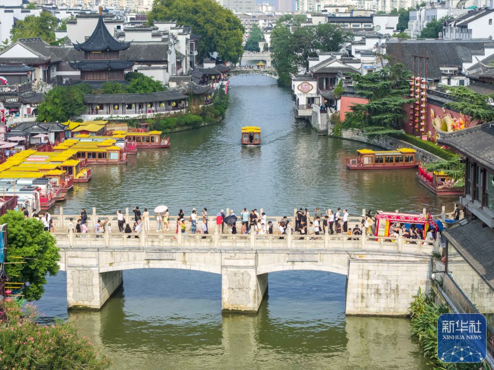 ↑ 10月5日,人們?cè)谀暇┓蜃訌R景區(qū)游玩(無人機(jī)照片)。新華社發(fā)(史俊攝)