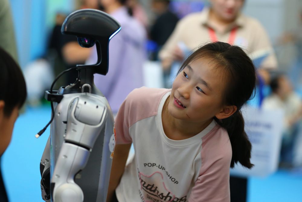10月2日,在山東省第九屆滕州書展現(xiàn)場,小朋友與機(jī)器人互動(dòng)。新華社發(fā)(李志軍攝)