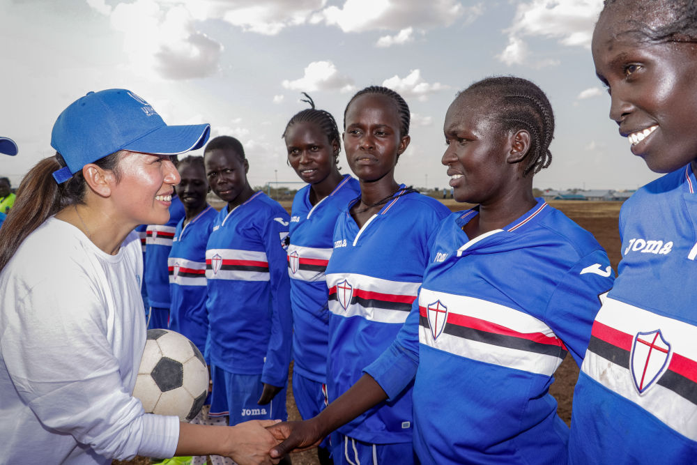 2024年2月21日,聯(lián)合國難民署親善大使、奧運(yùn)冠軍楊揚(yáng)(左前)與卡庫馬難民營女子足球隊(duì)隊(duì)員交流。新華社發(fā)(聯(lián)合國難民署供圖)