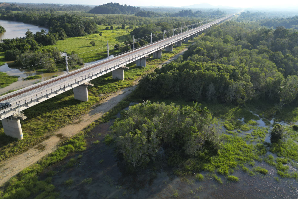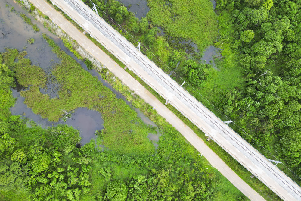 ↑10月9日,在馬來(lái)西亞彭亨州,馬東鐵軌道穿越一片濕地(無(wú)人機(jī)照片)。