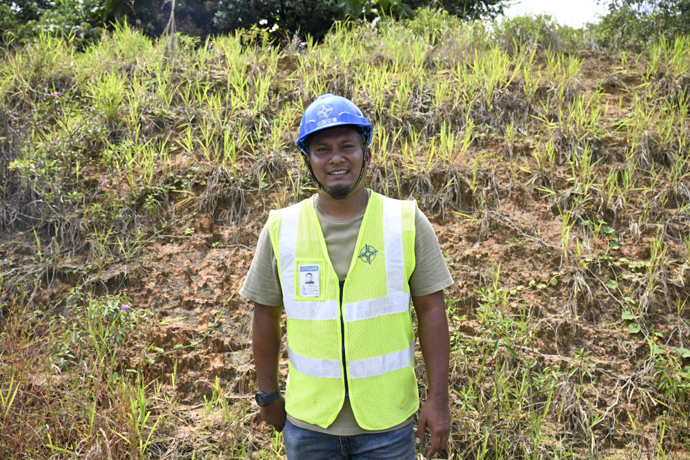 ↑10月10日,在馬來(lái)西亞彭亨州馬東鐵項(xiàng)目,環(huán)境官穆罕默德·斯亞哈丹·本·伊斯梅爾(左)和安全官何健耀聯(lián)合巡查