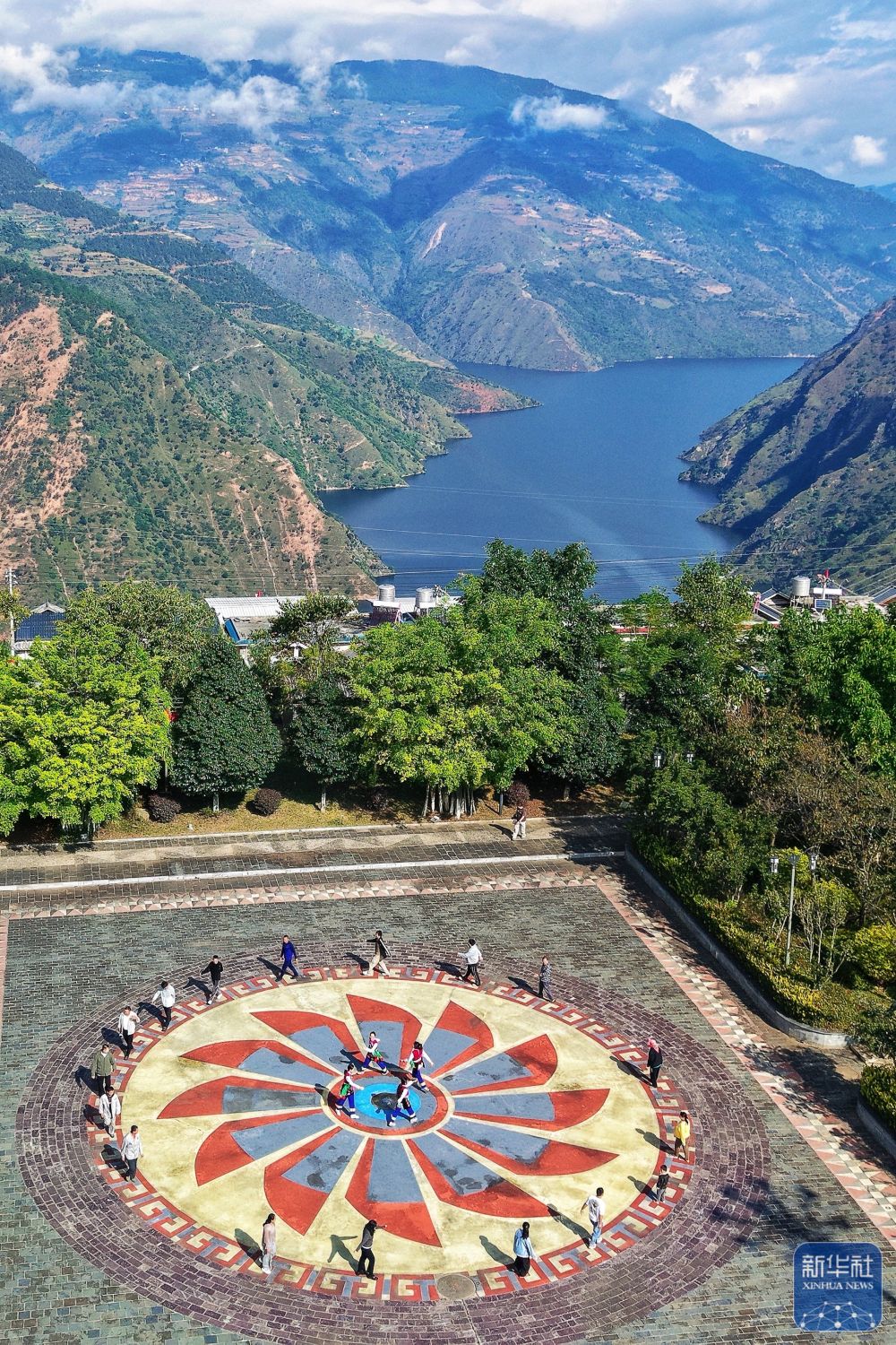 ↑ 10月31日,小灣東鎮(zhèn)居民在瀾滄江畔的移民廣場(chǎng)休閑(無(wú)人機(jī)照片)。
