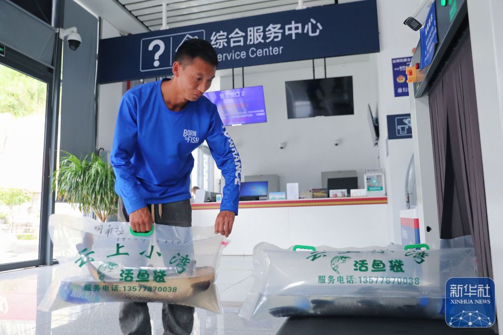 ↑ 10月31日,工作人員將裝袋、加氧后的小灣東鎮(zhèn)生態(tài)江魚(yú)放上安檢設(shè)備,準(zhǔn)備通過(guò)高鐵動(dòng)車(chē)運(yùn)往昆明。