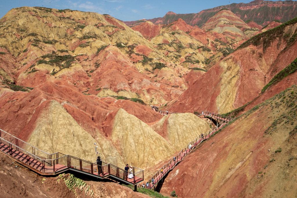 漫步景區(qū),放眼望去,紅色與青灰色交錯(cuò)分布,恍若置身于一幅水墨丹青中。移步登高,起伏的“彩丘海浪”直通天際。“人在畫中游,我從景中來(lái)?!边@是不少游客的感受。