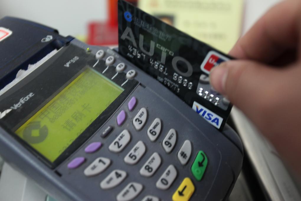 一商家工作人員在POS機(jī)上刷卡。新華社發(fā)(李俊鋒 攝)