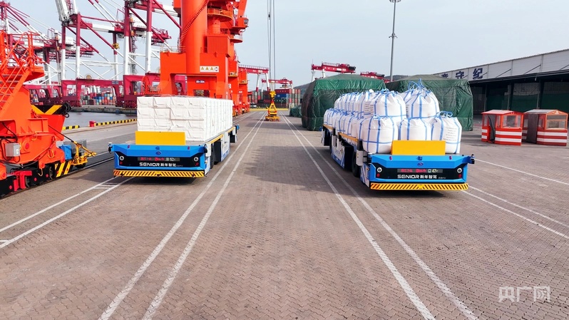 智能引導(dǎo)運(yùn)輸車裝載貨物在碼頭穿梭(央廣網(wǎng)記者 唐磊 攝)