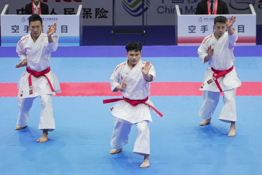 2025年11月6日,澳門代表隊(duì)在澳門舉行的第十五屆全國(guó)運(yùn)動(dòng)會(huì)群眾比賽項(xiàng)目空手道男子業(yè)余組團(tuán)體型半決賽中。新華社發(fā)