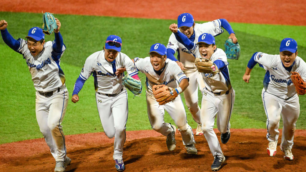 2025年11月19日,廣東隊(duì)球員在廣東中山舉行的第十五屆全國(guó)運(yùn)動(dòng)會(huì)棒球1-4名交叉賽后慶祝勝利。新華社記者 丁磊 攝